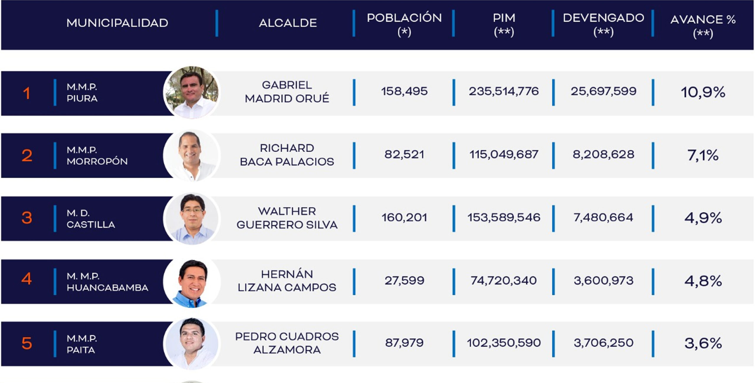 El resultado del análisis determinó que la Municipalidad Provincial de Piura (10.9%), liderada por el médico Gabriel Madrid Orué, y la Municipalidad Provincial de Morropón Chulucanas (7.9%), a cargo del abogado Richard Baca Palacios, lideran el ranking ocupando el primer y segundo puesto, respectivamente.
